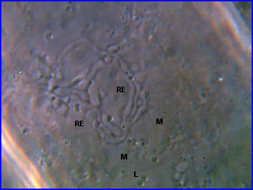 Le reticulum endoplasmique (RE) forme dans le hyaloplasme un réseau de canalicules anastomosés dilatés à certains endroits. Le réseau peut présenter de nombreux tubules coalignés (image de droite) au voisinage immédiat desquels on observe de nombreuses inclusions lipidiques (L) et des mitochondries (M).
