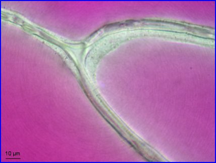 Dans les cellules turgescentes ci-dessus, le rouge neutre est dissous dans le suc vacuolaire qui contient naturellement de l'eau, des ions minéraux divers, des glucides simples, des acides organiques...). La vacuole est limitée par une membrane (tonoplaste) dont l'emplacement est indiqué sur l'image de droite mais qui est impossible à distinguer en microscopie optique (pouvoir séparateur de l'appareil insuffisant).