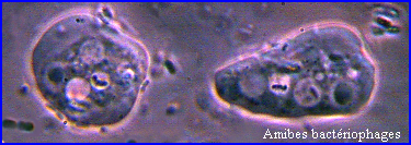 La petite amibe observée ici en contraste de phase est bactériophage. Les images mettent bien en évidence les vacuoles digestives qui contiennent des bactéries, préalablement internalisées, en cours de digestion.
