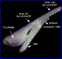 | Les courts filets des étamines ancrent le dispositif staminal à la corolle par leur extrémité inférieure, l'autre formant une jonction élastique avec le connectif. L'image montre bien comment les parties élargies du connectif, porteuses chacune, à l'origine d'une loge pollinique avortée, sont solidarisées et forment une pédale mobile (balancier) avec un dispositif en anneau ménageant un étroit passage. |
