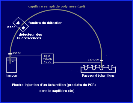 L'échantillon contenant les produits amplifiés (après PCR) est injecté (voir ci-dessous) dans un tube capillaire long (47 cm) de très faible diamètre interne (50 µm) rempli d'un gel de faible viscosité (polymère). Un très forte tension (15 kV) est appliquée au contenu du capillaire maintenu à température constante. Les fragments d'ADN dénaturé (monobrin) chargés négativement, soumis au champ électrique, migrent dans le gel, vers l'anode d'autant plus rapidemment qu'ils sont plus courts.